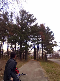 Tony and I went back to Illinois State Park this weekend and enjoyed a really nice bike ride. It was truly exhilarating, mainly because it was very, very windy and there was a constant threat of rain. We got there and took out the bikes and then headed towards the north branch of the park. I have been there several times but have never gone towards the Marina, so we decided to ride there. It was a great ride. We rode through forests and a small street. That lead us towards the power plant where I thought we had reached a dead end, but it turned out to be the entrance to the other area of the park. The air felt great. As we continued to ride, after my complaining and venting about the waste and destruction of our beautiful land, we came across a very peaceful and serene area. It had little mounds and some sand dunes.